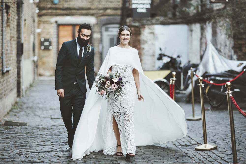 Plain Bridal Cape And Lace Wedding Dress For A Stylish City Wedding With Anemone Flowers